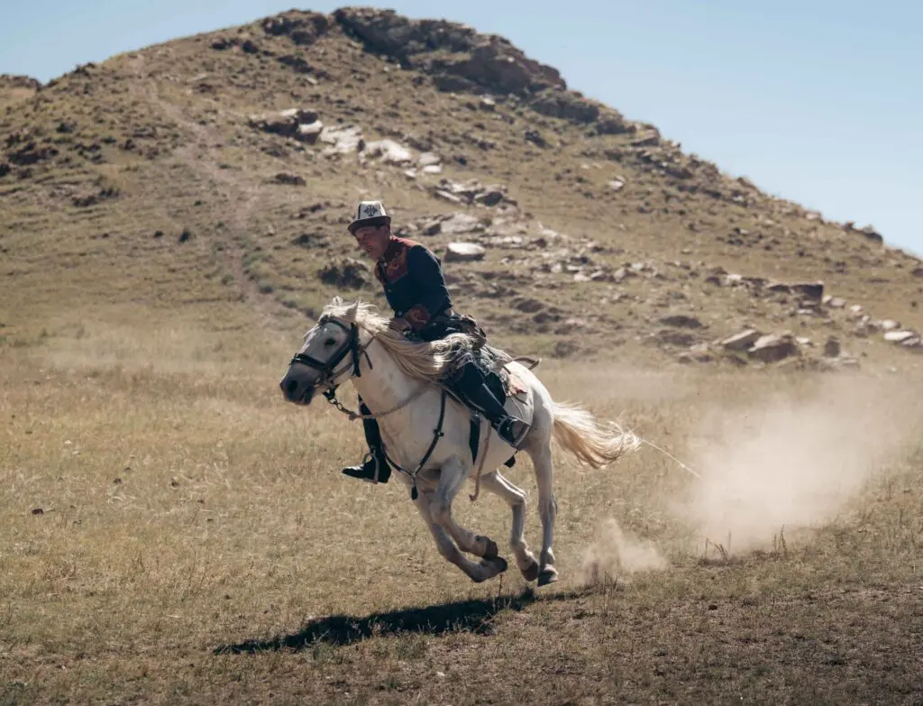 Chevaucher le long du lac Song-Kul, c’est s’aventurer dans un panorama à couper le souffle, à 3 000 mètres d’altitude, au cœur des steppes kirghizes. Montez à dos de cheval pendant 2 heures, accompagnés d’un guide, et traversez des prairies immenses, tout en profitant des vues spectaculaires sur le lac et les montagnes environnantes. Vous découvrirez la vie nomade dans des paysages sauvages, croisant des troupeaux en liberté et des camps yourtes traditionnels. Une expérience unique pleine d’adrénaline, où la nature et la culture se mêlent pour vous offrir une expérience aux émotions fortes.