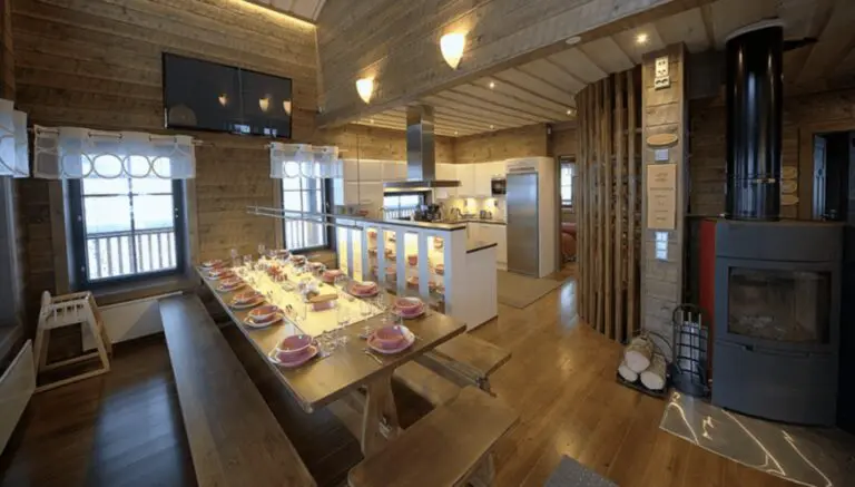 Les chalets possèdent également un grand salon avec cuisine ouverte et une grande table à manger, parfait pour profiter ensemble de la vue sur les paysages enneigés.